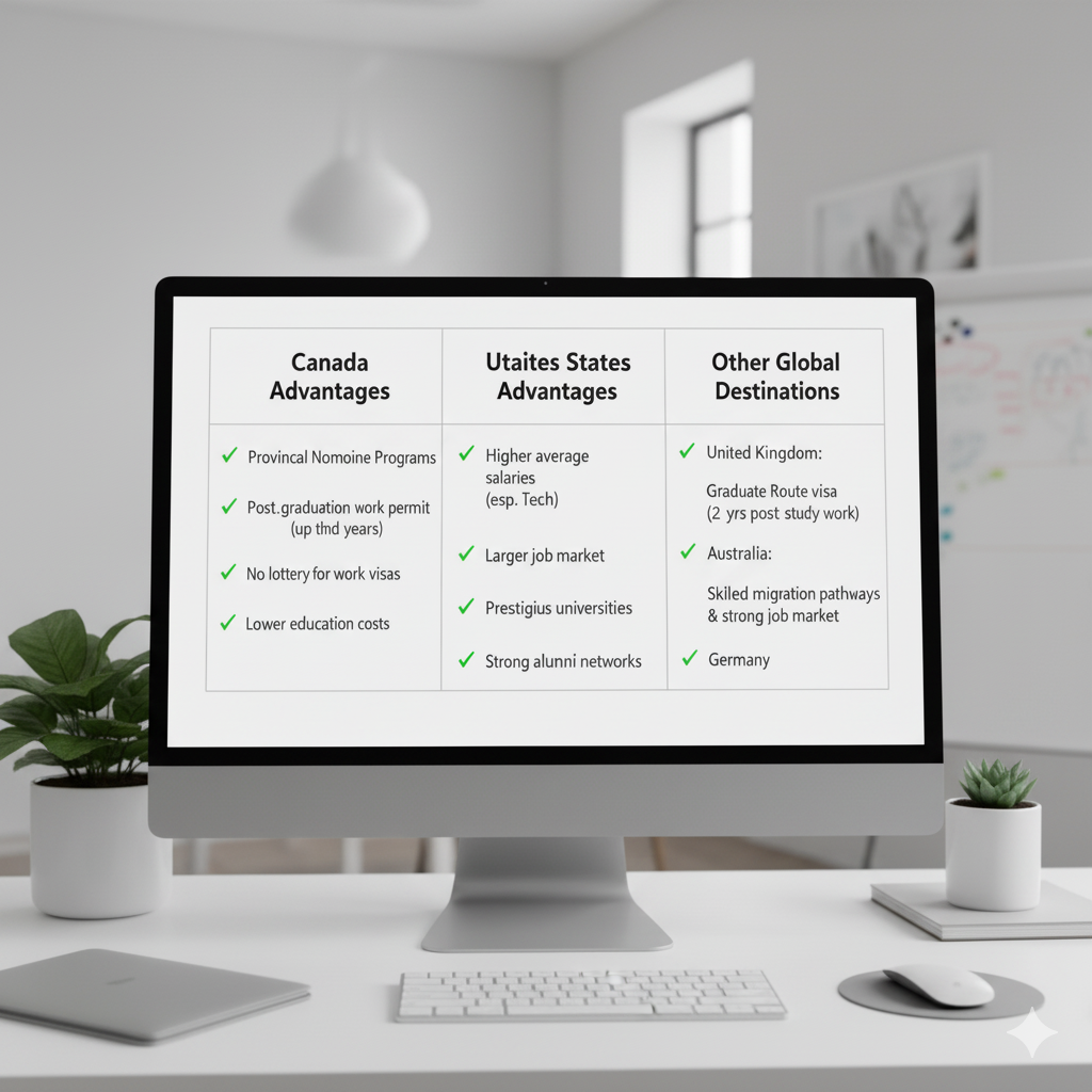 Consider Canada vs USA study and work options, the O-1 visa for exceptional talent, or gaining global exposure through Singapore, the UK, or Europe before returning to the U.S. through L-1 or EB-2/EB-3 pathways.